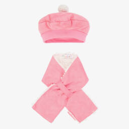 Pink hat and scarf set for girls by Spanish brand Agatha Ruiz de la Prada. Striped in blue, green and yellow, it is made in soft, comfortable, cotton-blend jersey. The hat has a pink, faux fur pom-pom on top, with a heart logo badge and a ribbed, turned-up brim. It comes with a matching scarf with pom-poms on the ends and a pink lining.