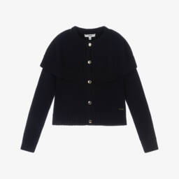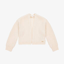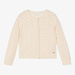 Sweet ivory cardigan for babye girls, by luxury French designer Chloé. Beautifully knitted in soft organic cotton, it has delicate mustard yellow and pink macramé trims and a tonal logo embroidered near the hem. It fastens with a hook and eye on the front for a cute, boho-inspired look.