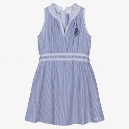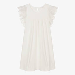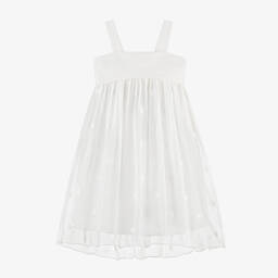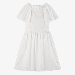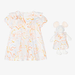 Beautiful ivory sundress for little girls from luxury French brand Chloé. Made and lined in organic cotton, this soft and lightweight dress has a ribbon logo pattern in pink, yellow and blue. It is gathered from the bodice for a full shape and has pretty scalloped trim for a discreet, yet signature designer finish. The dress is gently elasticated at the back, allowing it to slip easily over the head.
