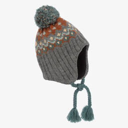 A cosy knitted hat for boys by Deux Par Deux, in navy blue with an orange, brown and white pattern. Made from a soft wool blend, it has a warm fleece lining and ear flaps with orange knitted ties. There is a large wool pom-pom on the top.