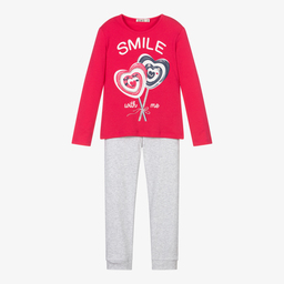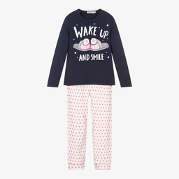 Navy blue and ivory long pyjamas for girls by Everything Must Change. Soft and comfortable, they are made stretchy cotton jersey, with a cosy brushed inside. The top has a pretty heart design on the front, in pink and glittery silver. The trousers are patterned in matching pink hearts and have a gently elasticated waistband.