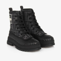 Girls and boys black lace-up boots by brand Fendi, made with luxuriously soft leather. They have statement brown fabric sock high-top inserts, patterned with the brand's FF logo in dark brown. Softly padded and lined in comfortable leather, these stylish boots have a ridged non-slip rubber sole.
