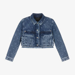 Great for making a designer statement, this silver puffer jacket for girls is from luxury label Givenchy. In a super shiny and metallic fabric, it is printed with the French label's signature 4G logo. A chunky silver zip fastening and zip-up pockets decorate the front. This cosy jacket has warm yet lightweight down padding and an internal pocket that secures with a popper.