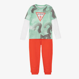 Baby boys navy blue trouser set by Guess is perfect for smarter occasions. Crafted from soft cotton jersey, the white long-sleeved top features an attached waistcoat and bow tie, fastening with poppers on the back. The trousers, detailed with faux pockets, are made of a stretchy viscose blend with an elasticated waistband. Both pieces are embroidered with the designer's name for a signature look. Limited quantities available.