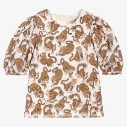 Teen girls navy blue cropped blouse by KENZO KIDS, patterned in an unmistakable Kenzo print. It has a colourful bamboo jungle pattern with giraffes, tigers and monkeys for a quirky style. The tie-up knot on the hem adds a creative, laidback flair and the top is made in lightweight viscose for comfortable wear. The brand's iconic logo badge is embroidered on one sleeve for a designer stamp.