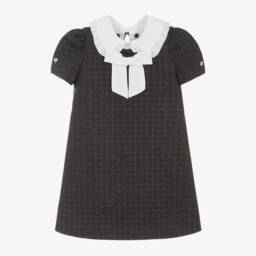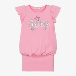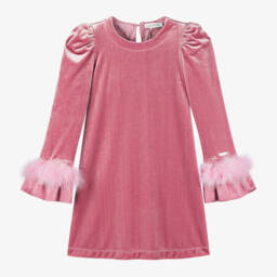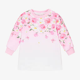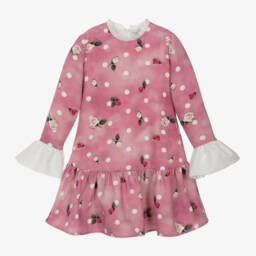 Pink and ivory shift dress for teen girls by Monnalisa, made in mid-weight viscose jersey. It has a Paris skyline with 'Paris' printed in black and a pink floral pattern along the hem. The sleeves are frilled with a pink velvet trim and there is a single button fastening on the back.