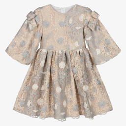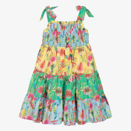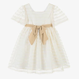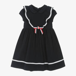 Red and navy blue tartan check dress for baby girls by Patachou. Made with a soft, midweight polyester and viscose blend, it has a sweet white ruffle collar, elasticated cuffs and a small red velvet bow. It fastens with buttons on the back, and has a soft, lightweight lining for comfort.