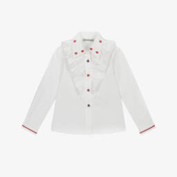 Girls pretty white crêpe blouse by Piccola Speranza, with yellow trims and navy blue piping. It has a stylish ruffle on the bodice, a navy blue grosgrain ribbon bow with diamanté, and ruffled three-quarter length sleeves.There is a soft lining at the front for modesty and comfort.