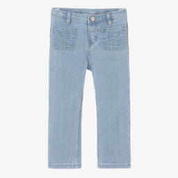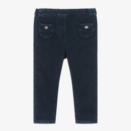Bright blue jeans for boys by Tartine et Chocolat, made in soft and stretchy cotton needlecord. They have classic five pocket styling, with a small brown faux leather logo tab on one back pocket. They fasten with a branded silver button and zip and have a useful adjustable waist for a comfortable fit.