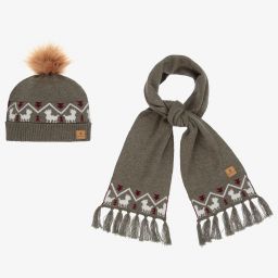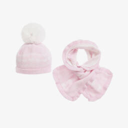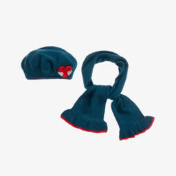 Pretty red hat and scarf set for girls by Spanish brand Tutto Piccolo, knitted in a soft, ribbed cotton blend. The stylish beret has a large grey faux fur pom-pom on the top. The scarf is knitted in a double layer for extra warmth and has a grey knitted bow trim on each end.
