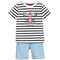 Boys two-piece shorts set from Week-end à la mer, made in soft and stretchy cotton jersey. The navy blue and white Breton striped T-shirt has red and yellow nautical logo embroidery and poppers on the shoulder. The navy blue shorts have an elasticated waistband and turned-up cuffs.