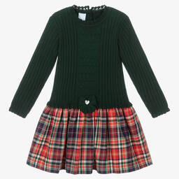 Dark green knitted cardigan for boys by Spanish brand Artesania Granlei, exclusive to Childrensalon. Soft and lightweight, it has a revere collar, neat, ribbed trims and is ideal as an extra layer on cooler days. It fastens with green buttons on the front and has a mother-of-pearl logo charm sewn by the hemline.