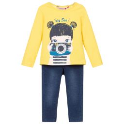 Smart-casual navy blue and mustard yellow cotton trouser set for little boys by Spanish brand Boboli. The poplin shirt is checked in shades of yellow, blue, red and green, with a pointed collar and button fastenings on the cuffs and down the front. The mustard yellow corduroy trousers have a navy blue trim, with pockets on both the front and back. They fasten with a button and zip and have an adjustable waistband to ensure a comfortable fit. A sweet navy blue knitted sweater completes the set. It has a cute car motif on the side in coordinating colours, with adorable puppy passengers.