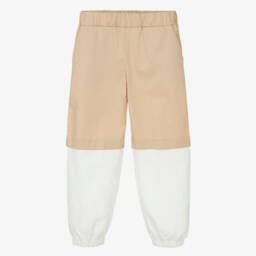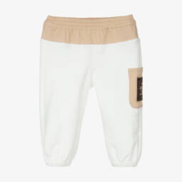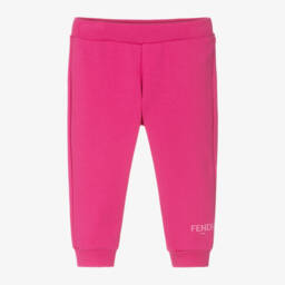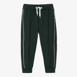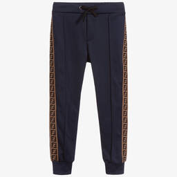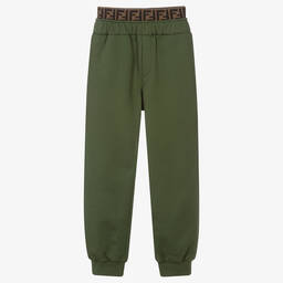 Comfortable black joggers for boys and girls by luxury Italian brand, Fendi. Made in mid-weight cotton jersey, they have sporty stripes on the side seam in green, white and yellow, with brown FF logo trim at the ankle. The waistband has an adjustable drawstring for a good fit and they have useful pockets on the front and back.