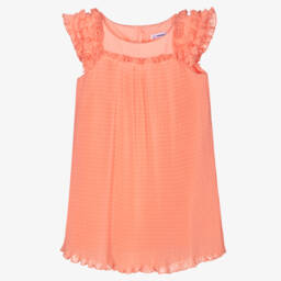 Pretty pink dress set for baby girls by Mayoral Newborn, made in lightweight polycotton. It has a tulle overlay with a spotted pattern and embroidered lace trims. There are pleats on the front of the bodice and matching lace trims on the cap sleeves. The dress is lined, with a tulle trim on the hem for added volume. Matching knickers complete the set.