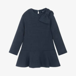 Navy blue, hooded, sweatshirt dress for little girls by Mayoral, made in soft and stretchy cotton jersey. It has an ivory ruffle hem, a patch pocket on the front, with embroidered gold dots and a zip fastening. There is a cute blue and beige teddy appliqué, with a large letter 'A' and 3D bow trim.