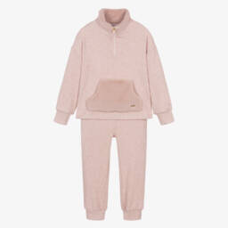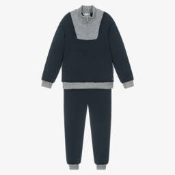 Girls navy blue top and trouser set from Patachou, exclusive to Childrensalon. Knitted in a soft and stretchy viscose blend, both pieces have burgundy red, navy blue and white checked trims. The top has a sweet ruffled collar, gold crest buttons and a red bow trim. The joggers have front pockets and elasticated waistband and cuffs.