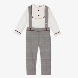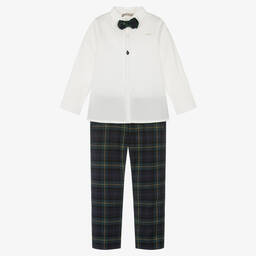 Smart trouser set for boys by Piccola Speranza, ideal for a special occasion. The pale ivory shirt is made in lightweight cotton twill and has a navy blue logo printed on one side, with matching piping and button fastenings on the front and cuffs. It comes with an adjustable navy blue bow tie with a burgundy red velvet knot. The navy blue, wool blend twill trousers have an adjustable waistband and jetted front pockets. They fasten with a button and zip.