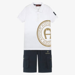Beige shorts set for little boys from AIGNER, made in soft, comfortable cotton. The white T-shirt has a gold metallic logo on the front incorporating the signature 'A' horseshoe and easy-to-use poppers on one shoulder for quicker dressing. The beige shorts have utility-style pockets and designer touches with a logo-printed drawstring and embroidered logo on one pocket.