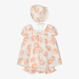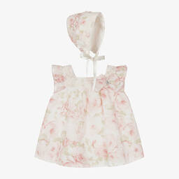 Baby girls white dress and bloomers set by Artesania Granlei, made in a soft, mid-weight cotton blend. The sweet nautical-themed dress has a sailor-style collar with a fixed bow, a soft voile lining, and a colourful fish, sailing boat and starfish print. The knickers have an elasticated waist and cuffs for comfort.