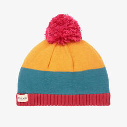 Navy blue hat for boys by Boboli, knitted in a soft cotton, viscose and wool blend. It has a fun grey rocket and white star motif on the front and a small logo tab on the turned-up, ribbed brim. There is a bright red pom-pom on the top and a cosy plush lining for extra warmth.