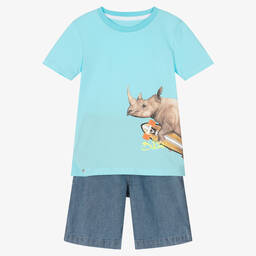 A delightful two piece cotton shorts set for girls by Lapin House. The linen-feel blue blouse is elasticated around the top and flows into a pretty flared hem. There are stand-out bows on the shoulder straps, with iridescent logos for a sparkly designer touch. The jersey shorts are beautifully patterned in pale blue and white stripes, with pink and yellow tulips. They have a gently elasticated waist for comfort and easy pull-on.