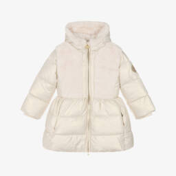 Dusky pink coat for girls by Le Chic, made in silky lightweight twill with a subtle shimmer. It has pretty frills on the collar, shoulders, and hem for a pretty look. There are two gold popper fastening gun flaps on the front and a heart logo charm above the hem. It fastens with a gold logo zip and is lined with shiny pink satin.