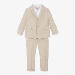 Boys navy blue and white three piece suit from Paz Rodriguez. The white shirt is made in a soft and lightweight, linen blend and has front button fastening. The jacket is made in mid-weight linen and is lined in lightweight cotton for a cool comfortable wear. It has faux flap pockets and smart single-breasted front button fastenings. The lightweight linen trousers have an elasticated, adjustable waistband with a zip and button fastening for a great fit. They have side pockets and turned-up cuffs.