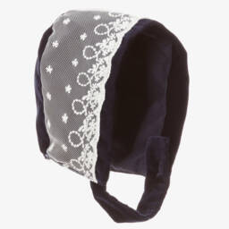 Lovely white bonnet for little girls from Phi Clothing, made in soft cotton with a woven diamond design. Securing under the chin with a button fastening strap, this pretty bonnet has an all-over navy blue polka dot pattern, with a romantic ruffle trim and a large fixed bow on one side.