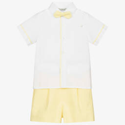 Younger boys green and beige two-piece shorts set by Piccola Speranza. The lightweight seersucker, collarless shirt has an aqua green and ivory check, with a chest pocket and black embroidered logo. The beige linen blend shorts have button-fastening patch pockets and an elasticated waistband with a drawstring tie.