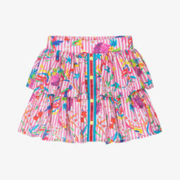 Pretty turquoise blue skirt for girls by Rosalita Senoritas, with a pink bow print. Made in lightweight cotton satin, it has a comfortable, elasticated waistband with a sash around the front that ties in a bow. The pink lining has organza frills that can be seen below the hemline.