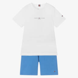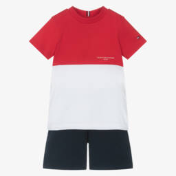 Teen boys red and white cotton shorts set by Tommy Hilfiger features a lightweight jersey T-shirt and mid-weight jersey shorts. The T-shirt has short sleeves, a crew neckline, and an embroidered Flag logo, while the shorts include a ribbed elasticated drawstring waist, side seam pockets, and a faux welt pocket. Limited quantities available for this stylish and practical outfit, perfect for casual wear.
