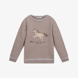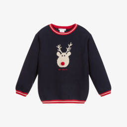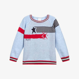 Younger boys red jumper by Tutto Piccolo. Made with a soft, lightweight cotton knit, this red sweater has a sweet car and bicycle design with blue and white stripes, a navy blue trim and button fastening on the back on smaller sizes.