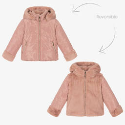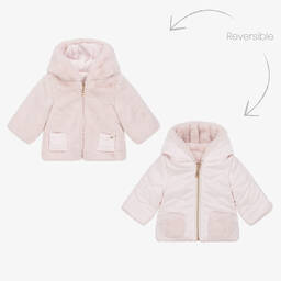 Navy blue and ivory tweed coat for girls by French designer Tartine et Chocolat, made in a soft, mid-weight viscose blend. It has a faux fur collar, fastens with logo buttons on the front and has concealed side pockets. Lightly padded, there is a large inverted pleat around the back and it is fully lined in navy blue satin patterned with logos.