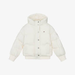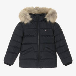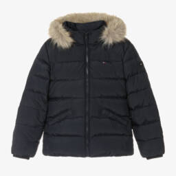 Teen boys navy blue baseball jacket by Tommy Hilfiger, with a modern TH Monogram appliqué on the chest. In a letterman style, it has the designer's name embroidered on the back and a small flag motif embroidered on the cuff. With faux leather sleeves in ivory, this fully lined jacket has a traditional boiled wool feel with ribbed trims striped in red and navy blue. The handy front pockets complete this cool and casual look.
