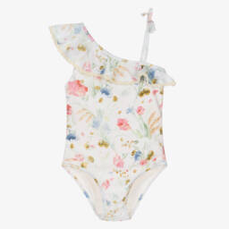 Beige and brown swimsuit for girls by Australian label Zimmermann, made in silky smooth and stretchy fabric. This feminine, fully lined piece is patterned in a patchwork paisley print, incorporating shades of blue, pink and ivory. A pretty ruffle decorates the neckline and continues around the back, trimmed beautifully with a cotton crochet edge. The slim shoulder straps crossover on the back and can be easily adjusted for a great fit.