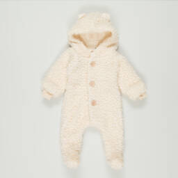 The ivory check sherpa pramsuit for boys by 1 + in the family is a charming addition to any winter wardrobe. Crafted with a delightful beige and grey check pattern, this soft and stretchy hooded pramsuit features a cosy polar fleece lining and ribbed cuffs for added warmth. Button fastenings on the front make dressing easy. Suitable for keeping little ones snug during chilly adventures, this pramsuit is available in limited quantities, so don't miss out.
