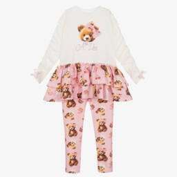 Pale blue cotton leggings set for girls by British brand A Dee. Made in comfortable jersey with a warm, fleecy inside, the top has a super soft, cosy, faux fur hood and a matching pouch pocket. There is a sparkling diamanté logo on the front, neat, ribbed cuffs on the long sleeves and vents on the side seams. The full length jersey leggings have a comfortable, elasticated waistband and a diamante 'A' on one ankle. The set is easy to wear, with both pieces simply pulling on.
