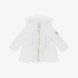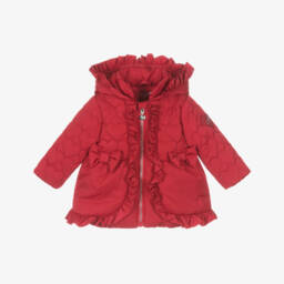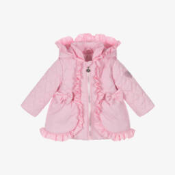 This pink puffer coat by A Dee is a charming addition to any little girl's wardrobe. Designed for warmth and style, it features a heart-quilted pattern on the top, with a pretty bow on the back and delicate frill trims. The cosy padding and soft fleece lining ensure comfort during the colder months, while the hood provides extra protection. Fastening with a shiny silver zip, it has useful front pockets and a rubberised logo patch on one sleeve for a signature finish.