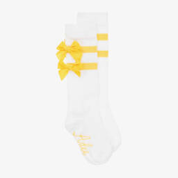 White knee-high socks for girls by A Dee feature charming pink and blue bows. Crafted from a soft and stretchy cotton-rich blend, they showcase elegant satin bows at the back, complementing the vibrant stripes at the top. The scalloped finish and discreet logo on the sole add a touch of sophistication. Perfect for pairing with spring outfits, these socks offer both style and comfort. Limited quantities available, don't miss your chance to add these to your collection.