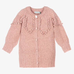 Soft beige knitted cardigan for girls by Abel & Lula, with bobble stitch detailing. It is embroidered with sweet floral motifs, it fastens with pearly beige buttons. It is finished with ribbed trims.