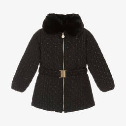 Girls hooded black puffer jacket by Abel & Lula features a luxurious faux fur trim. Crafted for warmth and style, it includes lightweight padding and a silky exterior. The elasticated cuffs provide extra warmth, while zip fastenings secure the front and pockets. A detachable belt with golden logos adds a touch of glamour. Last chance to buy this elegant piece, lovely for adding warmth and style to cold winter days.
