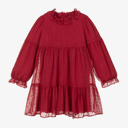 Navy blue dress for girls by Abel & Lula, made in sheer, lightweight plumeti chiffon woven with sparkly silver threads. This pretty tiered dress has a ruffle collar and button fastenings on the back. It is fully lined in soft viscose for comfort.