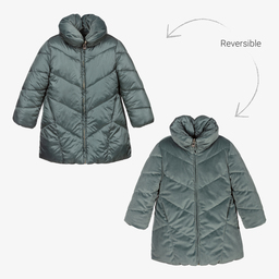 Girls dark pink padded puffer coat by Abel & Lula, with beautiful chevron-shaped stitching. It is made in silky satin on one side, and soft velvet on the reverse side. It fastens with a gold zip on the front and the satin side has zipped side pockets.
