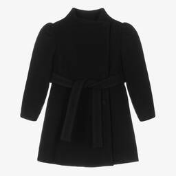 Stylish long red coat for girls by Abel & Lula, made in a soft virgin wool blend. Collarless, it has an elegant A-line shape and puffed sleeves, with off-centre button fastenings on the front. The silky lining is patterned with discreet logos and there are concealed pockets in the side seams. The tie belt is removable and has a gold metal logo on the back for a subtle designer finish.