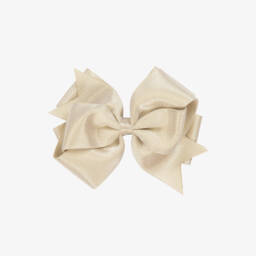 A lovely gold hair clip for girls by Abel & Lula, made in softly shimmering, silky fabric. This charming bow accessory is ideal for adding a touch of elegance to any outfit. It has a sturdy metal clip underneath to secure it in place.