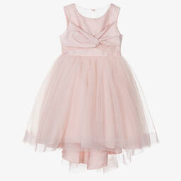 Girls white tulle waterfall dress by Abel & Lula, designed with voluminous layers of delicate tulle and a cotton lining for comfort. The silver thread bodice features a wrap-over style and a sheer square back with a faux pearl button fastening. Perfect for weddings or parties, the dress has a fixed sash that ties at the waist and a waterfall effect at the back of the skirt. Limited quantities available.