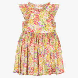 Lovely yellow and green colourful floral dress for girls, by Abel & Lula. Made in soft and luxurious crêpe de chine, it has sweet flutter sleeves, a ruffle trimmed neckline, and a gorgeous cut-out detail at the back.