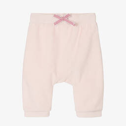 Sweet aqua blue casual trousers for baby boys and girls by French brand Absorba. Comfortable and stretchy in terry towelling, they are made from soft organic cotton with cuffed legs. Easy to pull on, they have a gently elasticated waistband with a red and white striped faux drawstring to tie on the front.