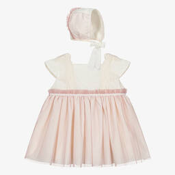 Girls ivory and blue tulle dress set by Abuela Tata features a square neckline and capped sleeves with an embroidered tulle overlay and lace trim. The gathered tulle skirt offers lightweight underlayers for added volume, complemented by a ruffled waistline and velvet trim. A concealed back zip ensures easy dressing. The set includes matching knickers and a bonnet with a velvet ribbon tie. Limited quantities available – last chance to buy.